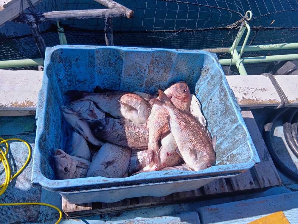 生け簀内への水中ドローンの潜航では、令和4年に実施した検討事業で確立した養殖魚に影響を与えない水中ドローンの航走方法を用いて、各種の検証実験を行いました。その結果、本養殖生け簀においては、生物ドレッジ型でのへい死魚回収が適切であることが分かり、最終的にへい死魚回収ツールを取り付けた水中ドローンで、1回の潜航につき、40cm程度のサイズで最大15尾のへい死魚を回収することがきました。