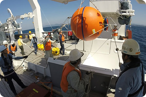 強流域での係留系設置は流出しないための錘計算や安定した計測を行うため係留系の傾きをできるだけ抑えることなど様々な検証を行い係留系を設計します。また係留系の設置や回収作業は2ノット、3ノットを超える流れの中で狙った位置に係留系を設置するため、船の操作と設置作業の連携が何よりも重要になります。