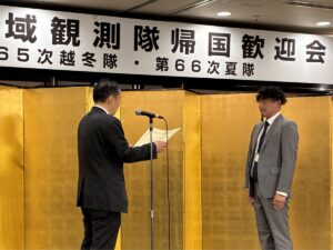第66次南極地域観測隊員として参加した弊社技術者 野口智英が、「南極地域観測功労者」として表彰されました。受賞式は、2025年4月24日、明治記念館で開催された南極地域観測隊帰国歓迎会の会場で行われました。