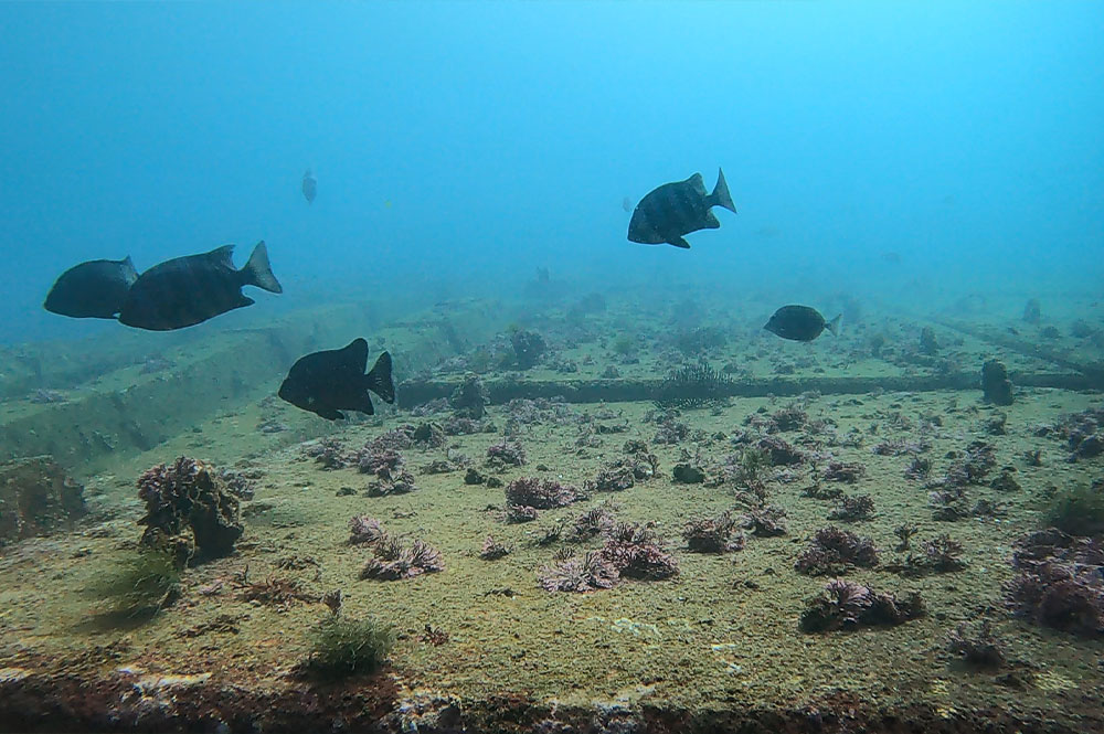 かつてのサンビーチ周辺はカジメ場が広がっていたそうですが、現状では磯焼けが進んでおり残念ながら水中ドローンでカジメを見つけることはできませんでした。