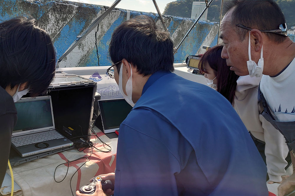 沖合での水中ドローン観察を終えたあとは、停泊地に戻って未来創造部のみなさんに水中ドローンの操作体験をしていただきました。最初は水中ドローンの操作に戸惑い、思い通りに操作できなかったようです。それでも楽しく水中ドローン操作を経験いただき、水中ドローンの有用性を感じていただけたと思います。