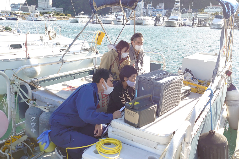水中ドローン観察には未来創造部の作業艇を利用させていただきました。当日は風が強かったですが、海中の濁りは少なく順調に水中ドローン観察を進めることができました。