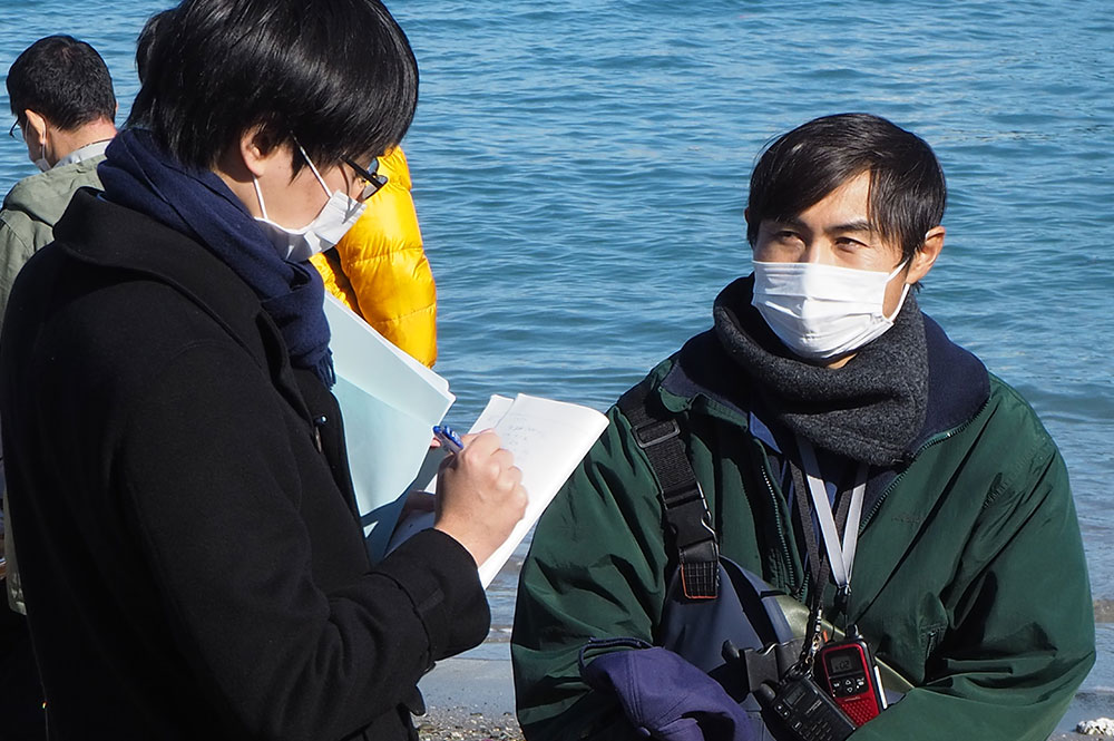 報道各社には本実証試験の意義や小型ASV、ウニ密度マップに関する新しい技術について当社の担当者に取材いただきました。