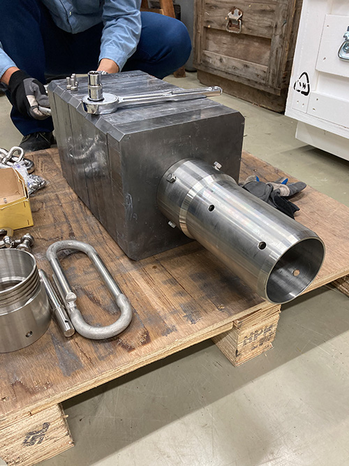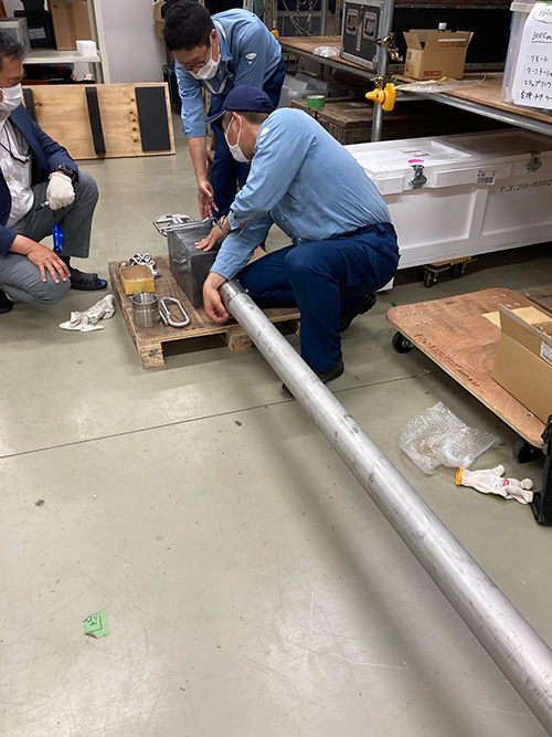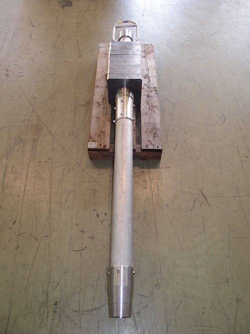 本製品を製作するにあたって、実績のある20mピストンコアラー用パイロットコアラー(採泥管1m)を基にし、単独使用、かつ3mの採泥管で堆積物を採取できるよう、全体の重量を増加させた仕様としました。錘は8枚(21㎏/枚)に分かれており、錘を減らすことで全体の重量を軽くすることができますので、底質の状態に合わせた堆積物採取が可能です。