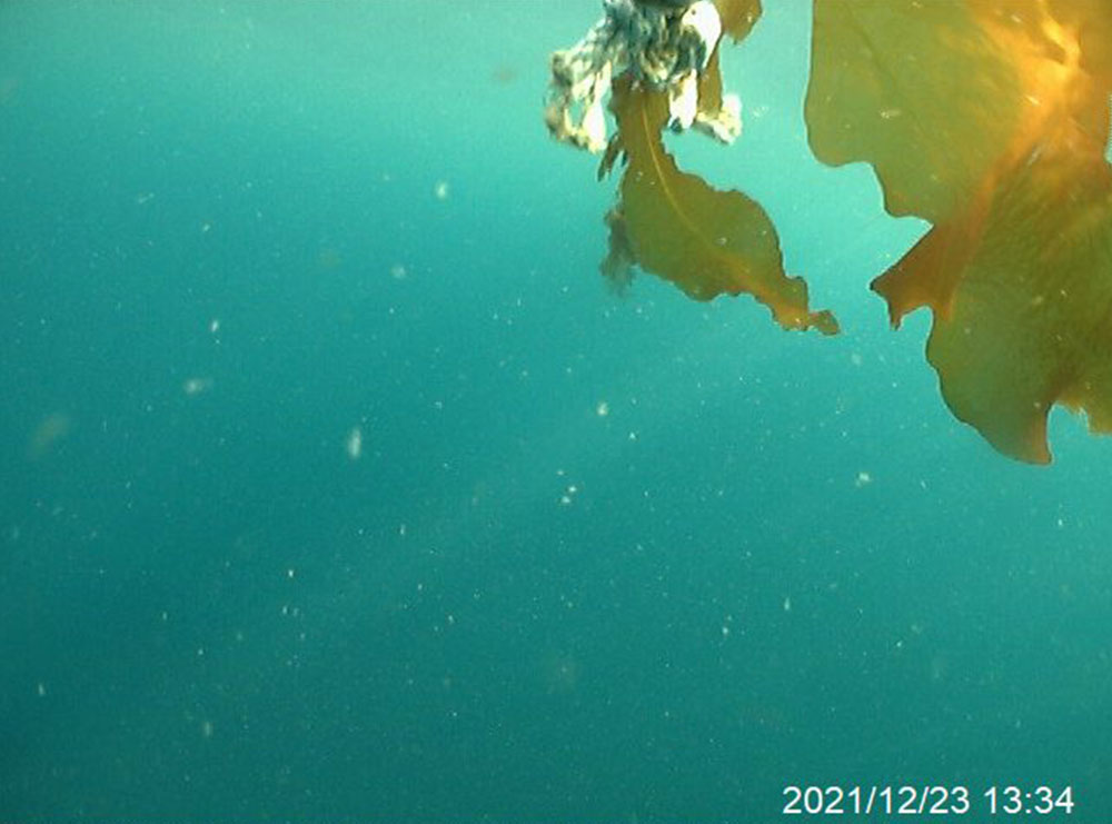 今年度は海況が悪い日が多く、カメラの亡失の可能性があったため、撮影は1月8日で終了としました。1月7日の写真を見ていただくとお分かりなると思いますが、養殖しているはずのワカメがほとんど育っておらず、これではワカメの収穫を期待できません。このような状況が日本各地のワカメ養殖の現場で発生しています。当社では食害に有効な手段をまだ持ちえておりませんが、漁業者の皆様と一緒に対策にも取り組んでいきたいと思います。