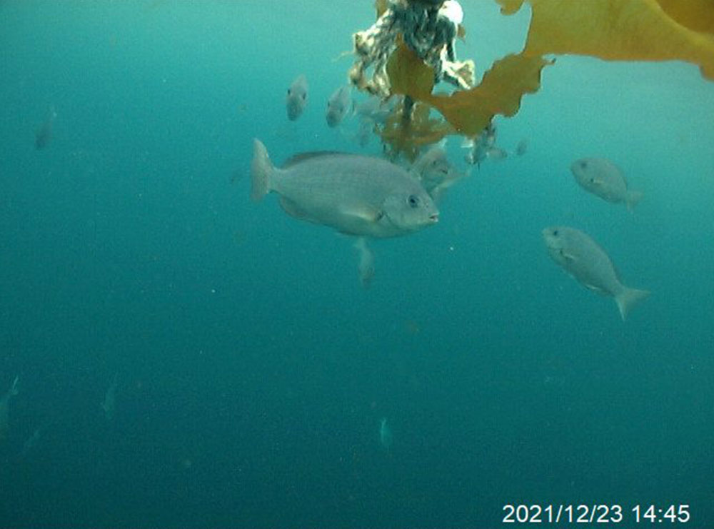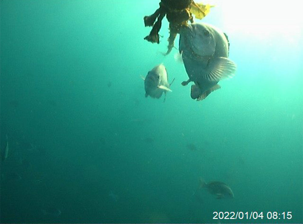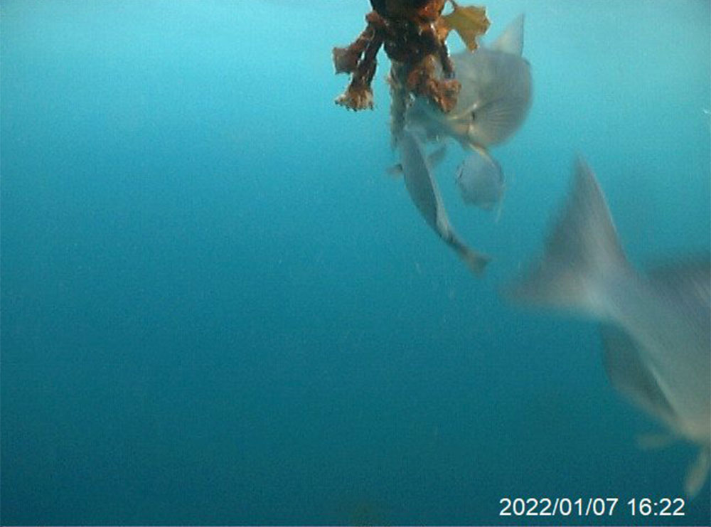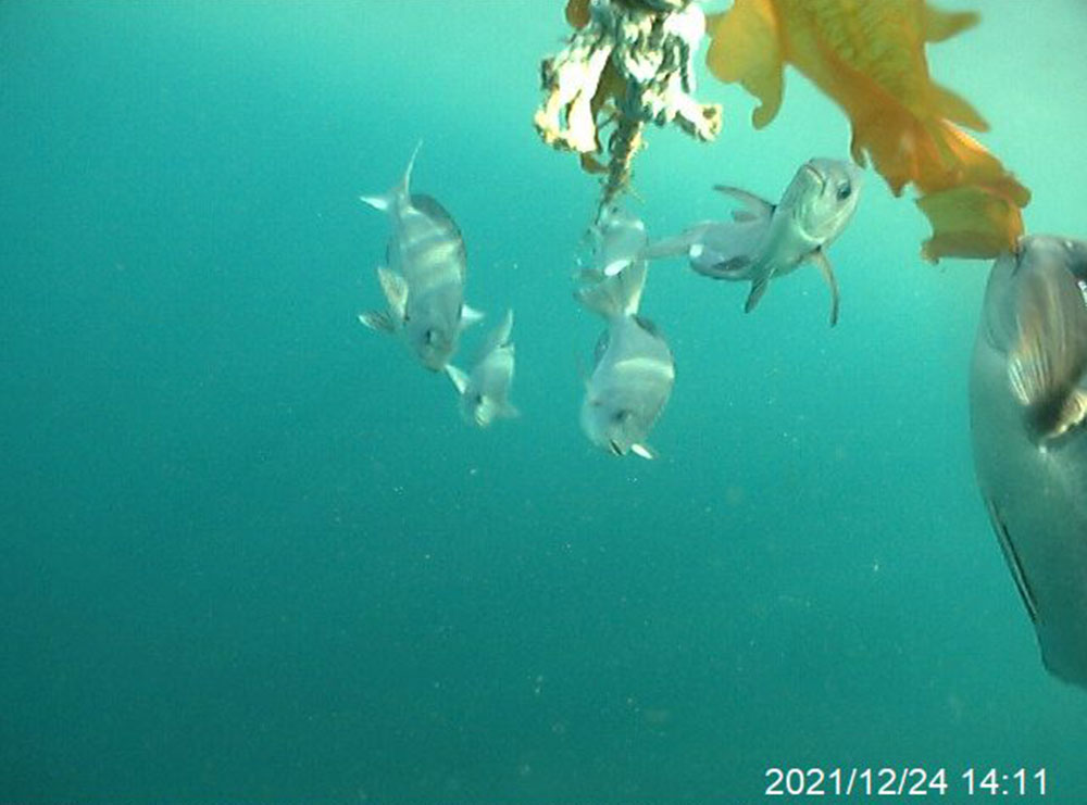 ワカメ養殖を開始した22日当日の15時頃から魚影が写り始め始め、翌日の23日にはメジナと思われる魚が10尾以上集まっているシーンも撮影されました。あまりの魚の多さに驚きです。これではワカメの差し芽も全滅してしまいます。