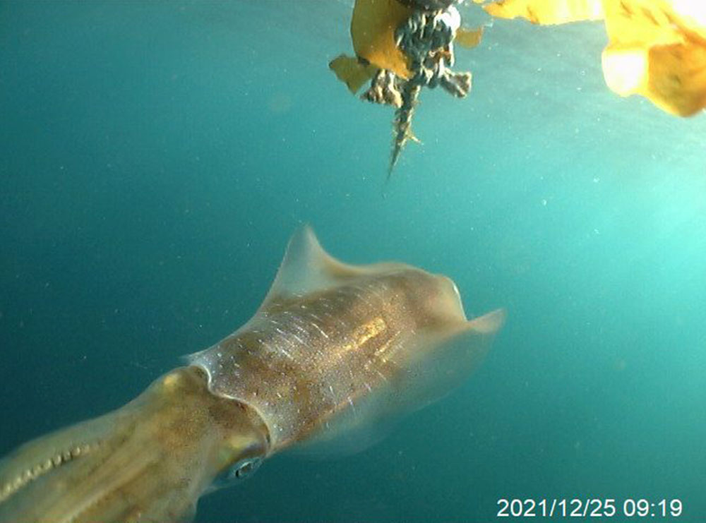 今年度は撮影期間中にアオリイカが登場しました。養殖施設に集まる魚たちを追っているのかもしれません。12月25日は朝8時から12時前までの4時間にわたって撮影されていました(同じ個体ではないのかもしれませんが)。これまで他の漁協のワカメ養殖施設での撮影でアオリイカが登場したことはなく、新たな気づきとなりました。