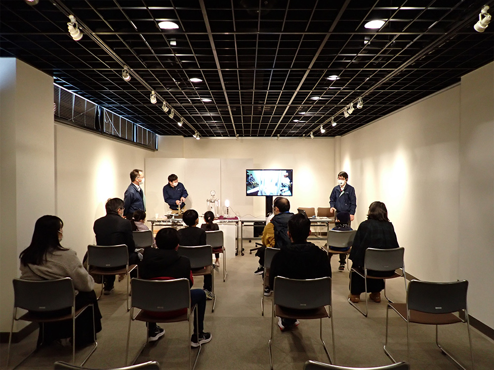 1月21日と1月22日の2日間にわたり、横須賀市「第6回みんなの理科フェスティバル」(以下、「理科フェス」)が開催されました。「理科フェス」は、「子どもから大人まで、みんなが『理科』でつながる」をキャッチフレーズに、横須賀市自然・人文博物館および同市文化会館を会場として2017年より開催されています。今回、昨年に引き続き、「海」と「地球」の魅力を伝えるアウトリーチ活動として、「理科フェス」に参加させていただきました。1日目は、「令和3年度 海の次世代モビリティの利活用に関する実証実験」のポスター発表を、2日目は、加圧実験水槽を用いた「水圧をテーマとした実験教室」という題名で実験ショーをおこないました。
