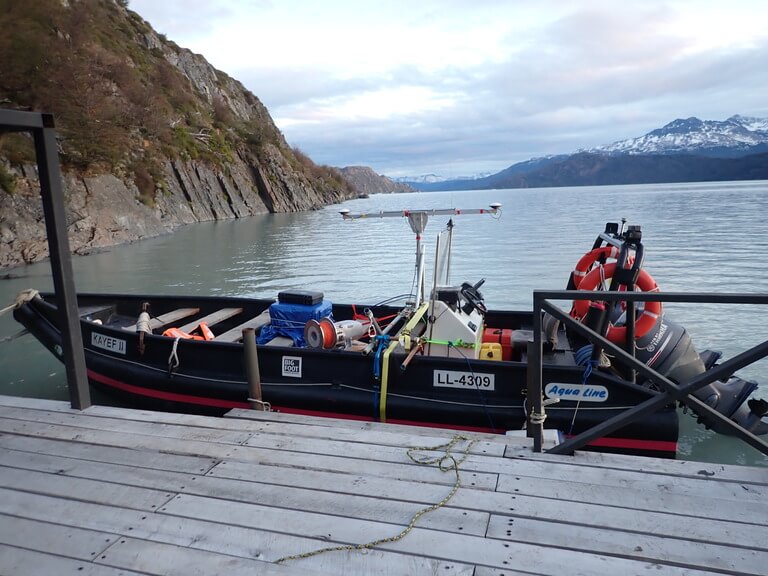 2023年3月に国立大学法人北海道大学低温科学研究所の杉山先生からご用命いただき、当社職員が同行してチリ国の南パタゴニア氷原グレイ氷河にあるグレイ湖を訪れました。新型コロナ感染症の影響で途絶えていたグレイ氷河の観測を再開するとともに、新たにマルチビーム音響測深装置(以下、MBESと記載)を使用した湖底の地形調査と氷河末端の氷河壁面の形状を捉えるという淡水域では前例のない調査の実施が目的でした。当社は2021年度に導入したMBESを現地に持ち込み、グレイ湖での調査を担当しました。