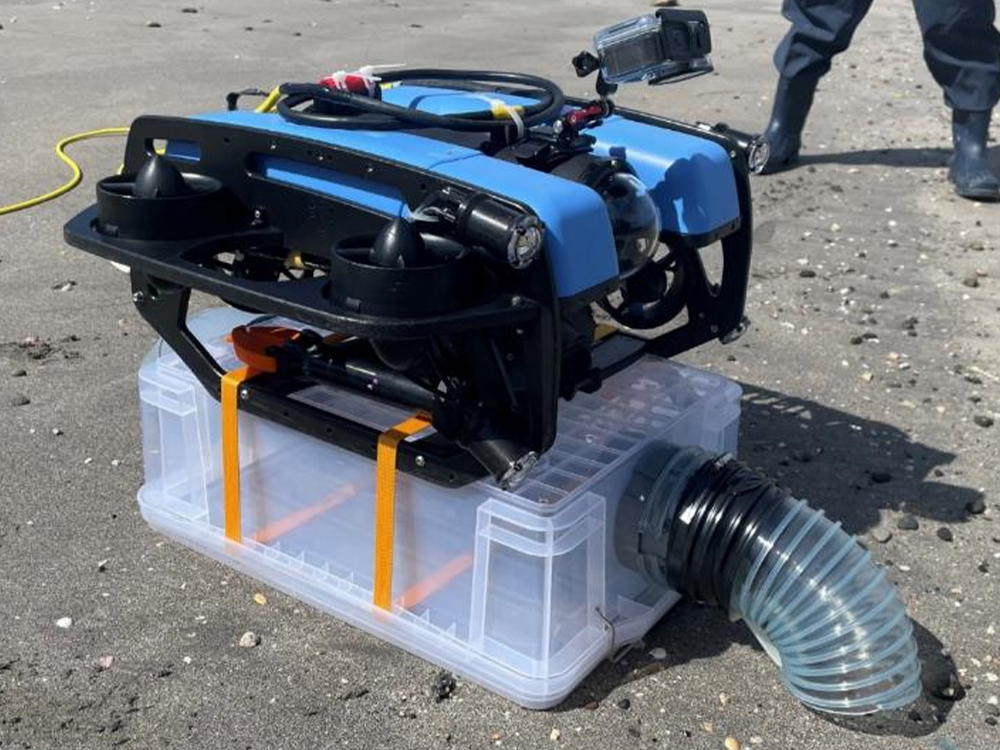 プロトタイプのスラープガンとキャニスターを取り付けた水中ドローン