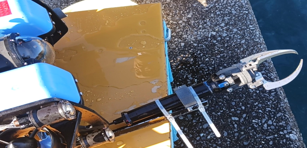 沿岸域でガンガゼ採取試験を実施するに際し、ガンガゼ用にロボットアームの掴む部分を大きくしたプロトタイプを製作しました。図3にプロトタイプのハンドを取り付けた様子を示します。ハンド部が大きいことから、その先端が水中ドローンのカメラ部から遠くなり、操作者は距離感を掴むのが難しい感触でした。ウニに近づいて、ロボットハンドを開き、ウニを掴むためにさらに近づきロボットハンドを閉じることは簡単なようで難しく、結果的にウニ採取に時間がかかることになりました。また、樹脂製のハンドだったため、採取中に破損することもあり、サイズも含めて再度設計から見直すこととなりました。