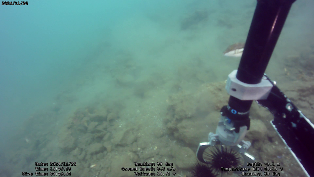 ガンガゼの時と同様につかんだ後にウニの棘が支えとなり、落とすことなく採取することができました。三つ爪ロボットアームを使用する際には、水中でウニを保管するカゴを用意して、採取地点とカゴを往復することにより、効率的に採取作業を進めることが可能です。