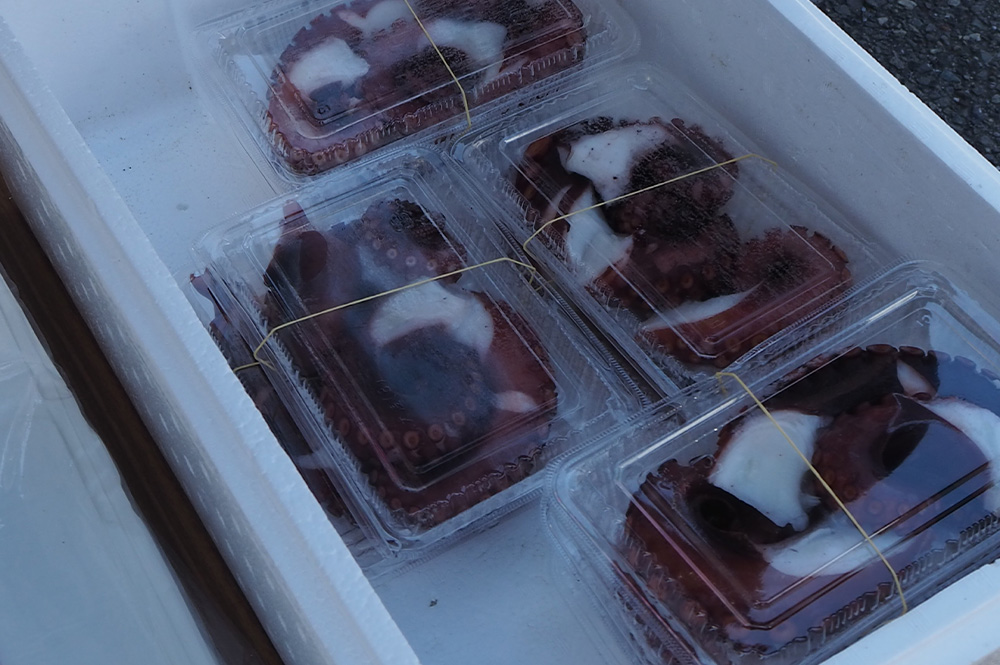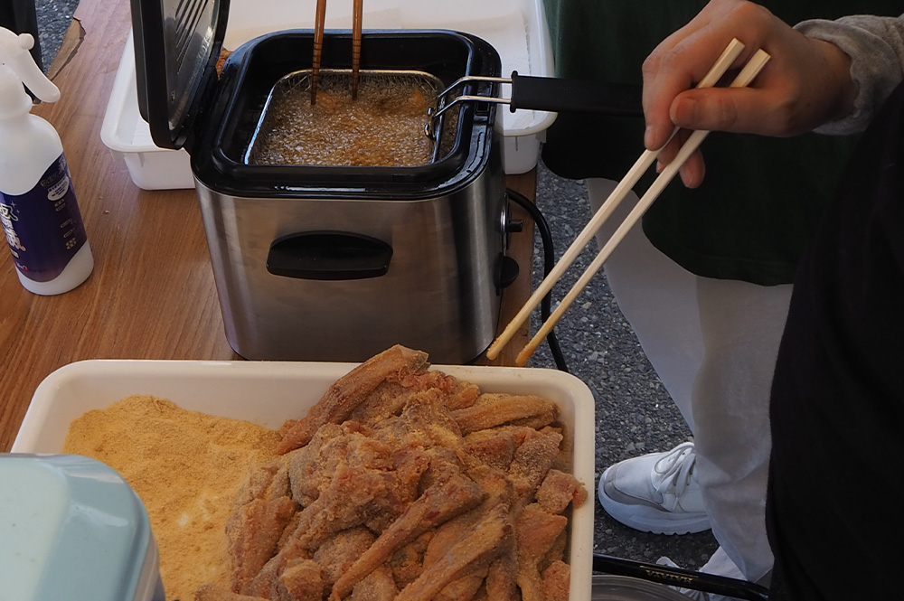 会場には「貝殻アート」「活魚販売」「タコ飯販売」などなど、幾つかのブースが設けられましたが、その中の1つに「アカエイの唐揚げ無料試食」のブースがありました。せっかく捕れたにもかかわらず、食卓に上がることなく処分されてしまう魚を「未利用魚」と呼び、アカエイも未利用魚の1つなのですが、少しでも資源の有効活用を考えていただければということで、今回は唐揚げとして来場者の皆さんに振る舞われました。目を閉じて食せば鶏の唐揚げと区別できないくらい(?)おいしいです。びっくりしました。7月22日のFacebook・Twitterに写真が載っていますが、私たちは前日にアカエイをさばくお手伝いを少しだけさせていただきました。